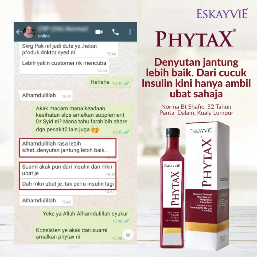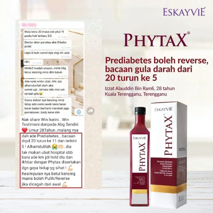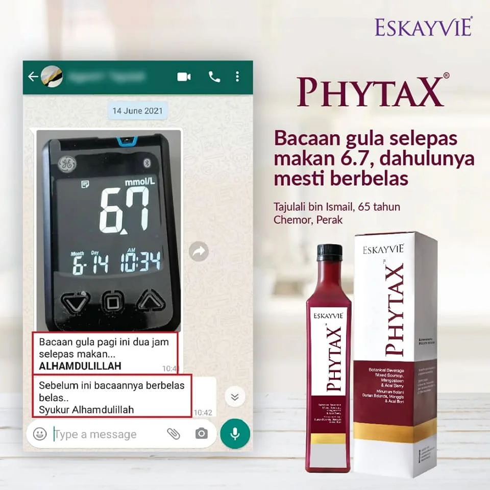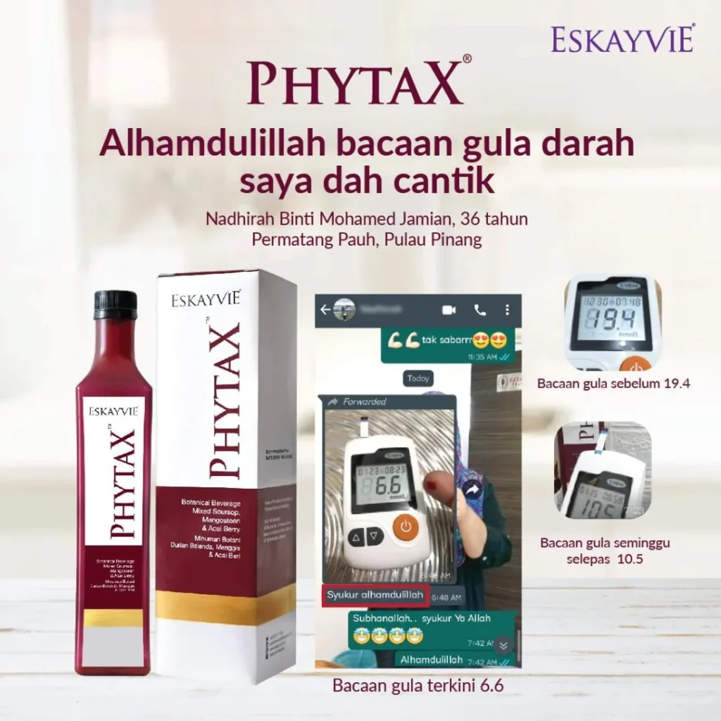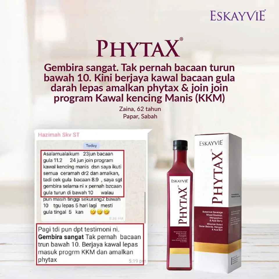 Minum Eskayvie Phytax secara istiqomah. Perhatikan bacaan gula darah. Dapatkan nasihat doktor secara berkala untuk mengubah dos ubat.