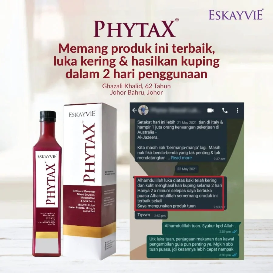 Sebab itu, kami bagi jaminan. Takda siapa pun rugi untuk cuba produk ESKAYVIE PHYTAX. Cubalah produk ni sekarang. Sekiranya… selepas dah amalkan selama 3 bulan. Kalau tak suka dengan kesan. Rasa tak Sedap. Tak suka botol. Tak suka bau. Tak suka texture. Tak suka dengan apa jua sebab. Pulangkan balik.