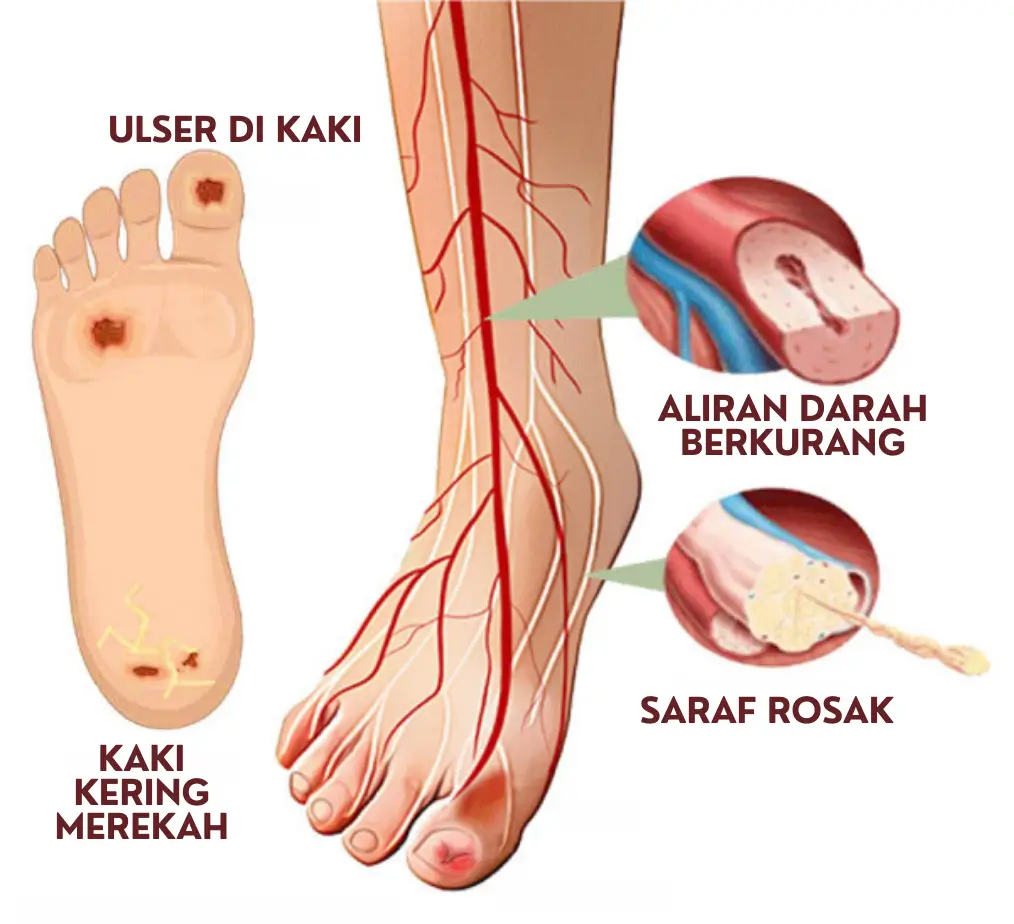Semakin lama, saluran darah akan mula mengecil dan mengganggu aliran darah terutamanya ke sel-sel saraf.